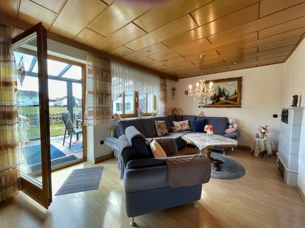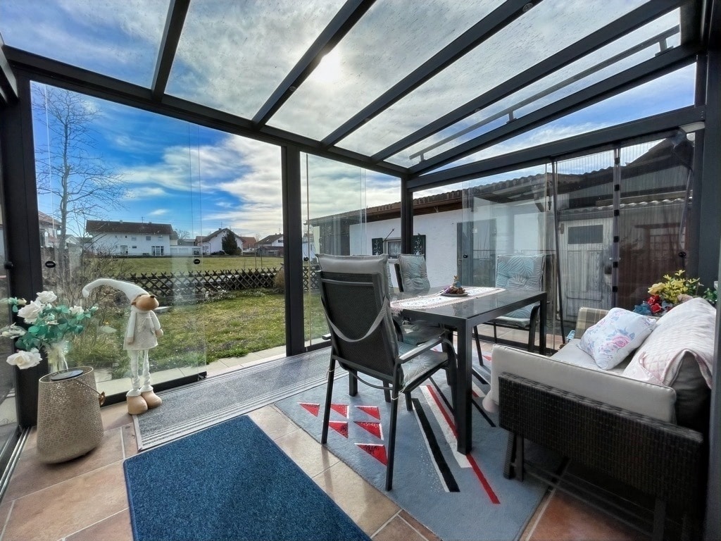 Über den Eingangsbereich mit Gäste-WC gelangen Sie zur Küche. Anschließend betreten Sie das Wohnzimmer mit Zugang zum im Jahre 2020 neu errichteten Wintergarten. Die Seitenteile können variabel geöffnet werden und insgesamt sorgt der Glasanbau für eine behagliche Atmosphäre und vergrößert den Wohnraum.