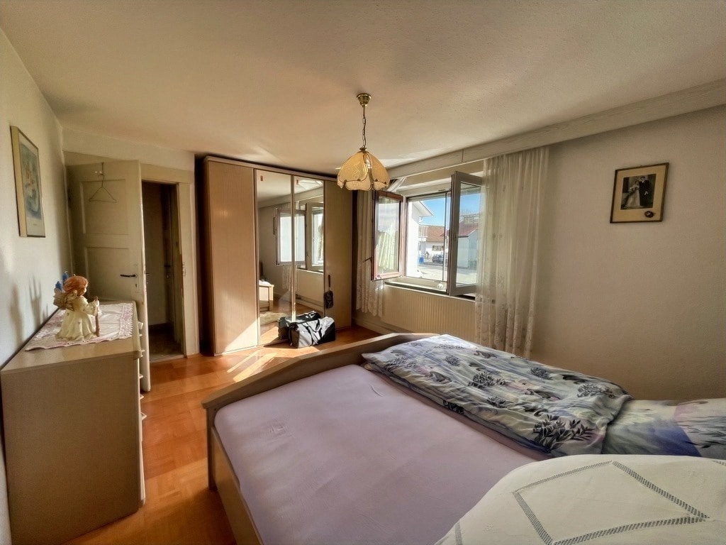 Im Obergeschoss befinden sich ein weiteres WC, zwei Schlafzimmer und das Bad. Von hier aus gelangen Sie auch in den geräumigen Stauraum über der Garage – ideal!