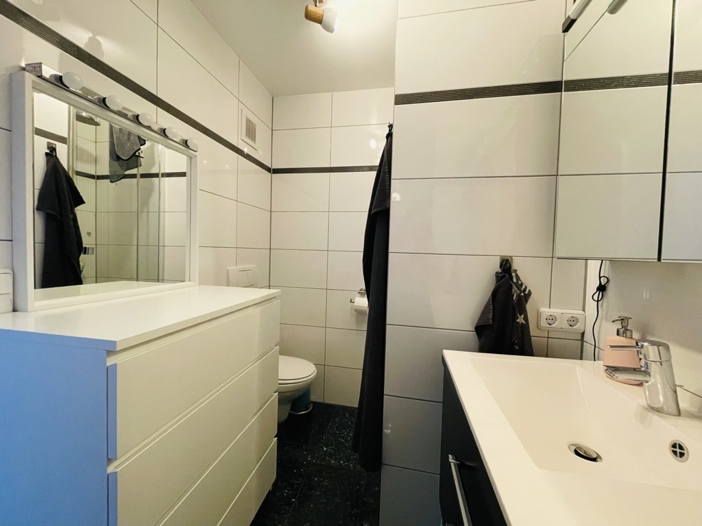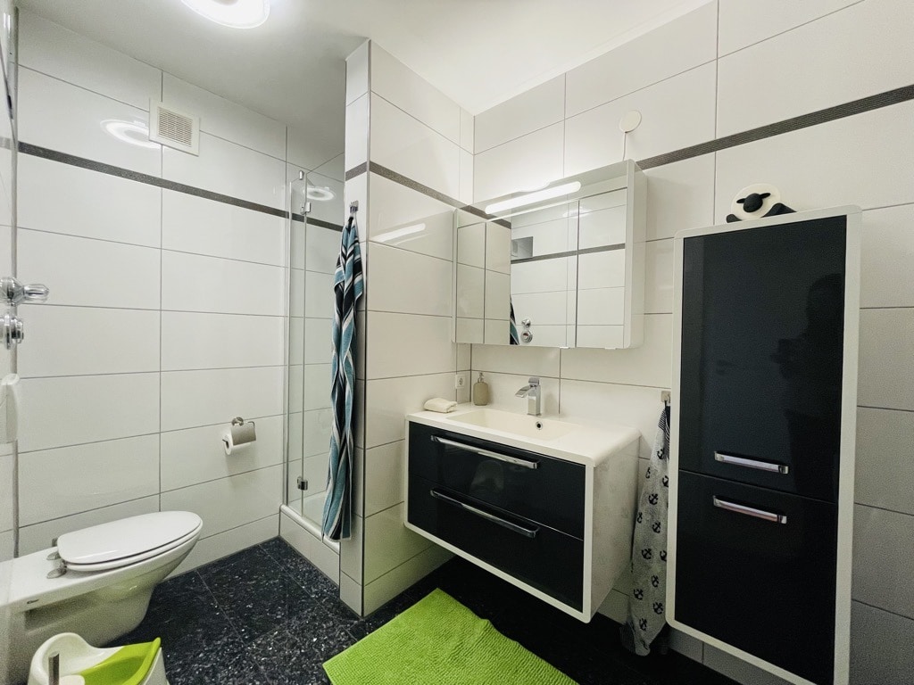Beim Betreten der Wohnung gelangen Sie in den geräumigen Flur und anschließend in das überaus große Wohn- und Esszimmer. Die neuwertige Einbauküche ist aus dem Jahr 2010 und sehr gepflegt. Des Weiteren befindet sich auf dieser Etage ein Badezimmer, zwei Schlafzimmer und ein Gäste-WC.